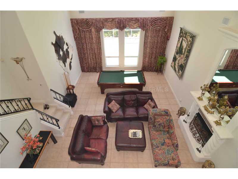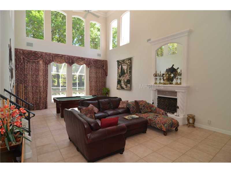 Family Room with pool table and gas fireplace, 22ft ceilings and lots of light.